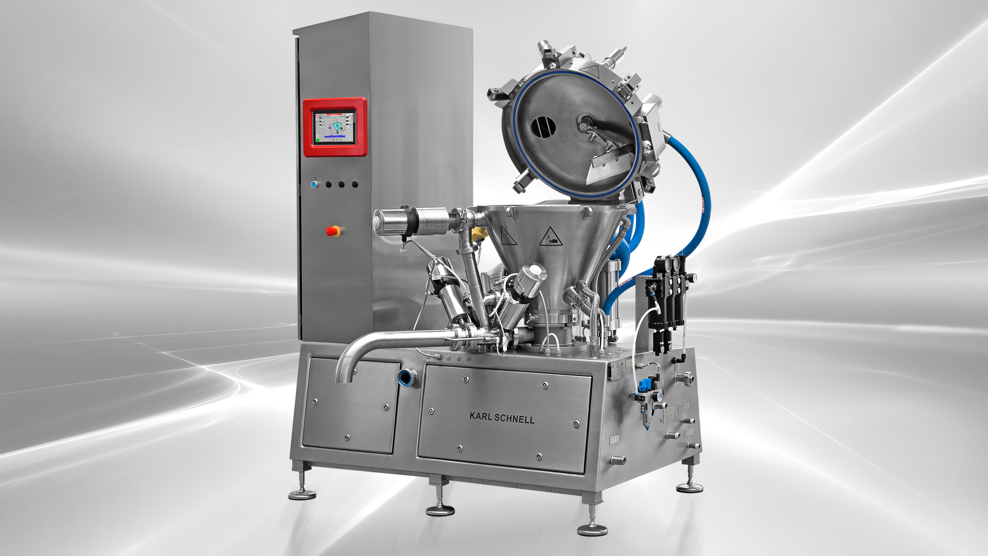 Der vertikale Prozessbehälter verfügt über einen Vorzerkleinerungsmotor mit Messern zur schnellen Einarbeitung von Pulverstoffen oder Öl in eine Wasservorlage.